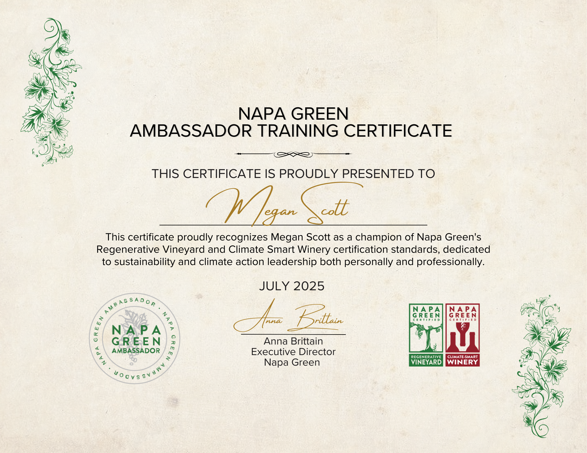 The recording of our June 2025 Napa Green Ambassador Training is now posted online. For the first time, we are offering those who attend the training, either in person or online, the chance to complete an evaluation and receive a Napa Green Ambassador certificate, as well as a logo that can be used in your signature and on social media platforms. You can add the recognition to your resume/CV!